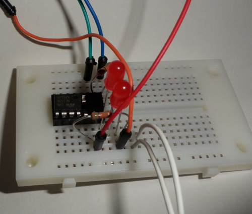 自己点滅LEDが一個だと点滅周期が一定になるので直列で2個繋げてます。